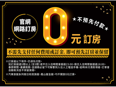 官網網路訂房不需先支付任何費用或訂金,即可預先訂房並保留。 ※ 訂房達以下條件,仍須先付款。 如訂房超過5間以上(含五間)或平日入住時間會超過23:00、假日入住時間會超過18:00,春節期間,連續假期,並請務必留下可聯繫到入住人之電話手機, 逾時未付清款項者,訂單會自動取消並不保留房間。 ※ 汽車旅館系列假日和民族館、鳳山館全館,均不開放0元訂房。