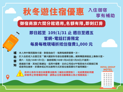 【入住御宿,享有補助】 御宿商旅六間分館適用,名額有限,即刻訂房 即日起至 109/1/31 止 週日至週五 官網、電話訂房限定 每房每晚現場折抵住宿費1,000 元 !!!請注意!!! 政府公告秋冬遊住宿優惠活動有【補助名額限制】,如經費提前用罄 即會停止受理補助申請,請務必注意活動專區公告之相關資訊。 ※ 補助需知 ※ 1.本人持中華民國身分證,散客自由行,每房每晚限優惠一次。 2.於入住前或入住當日至「擴大國旅秋冬遊住宿優惠活動」網頁專區掃描並上傳身分證。 3.週六、元旦(109年1月1日)、春節假期(109年1月24日至1月29日)不適用。 4.透過旅行業、其他訂房網站、信用卡優惠、合約公司或APP等其他方式間接訂房或使用住宿券、折價券或紅利兌換等方式折抵住宿房價均不適用補助。 http://fallwintertour.tbroc.gov.tw/customer_apply_page